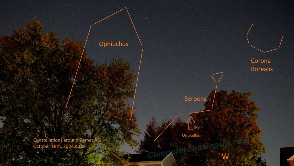 At this time of the year in the Northern Hemisphere, the West sky after Sunset is pretty boring, especially in light-polluted areas. The main constellations around Comet A3 – Corona Borealis, Ophiuchus, and Serpens – are not household names. The surrounding stars are not relatively very bright, with only the aforementioned Arcturus and Vega being the closest stars of note.