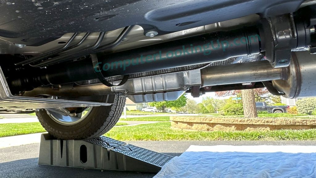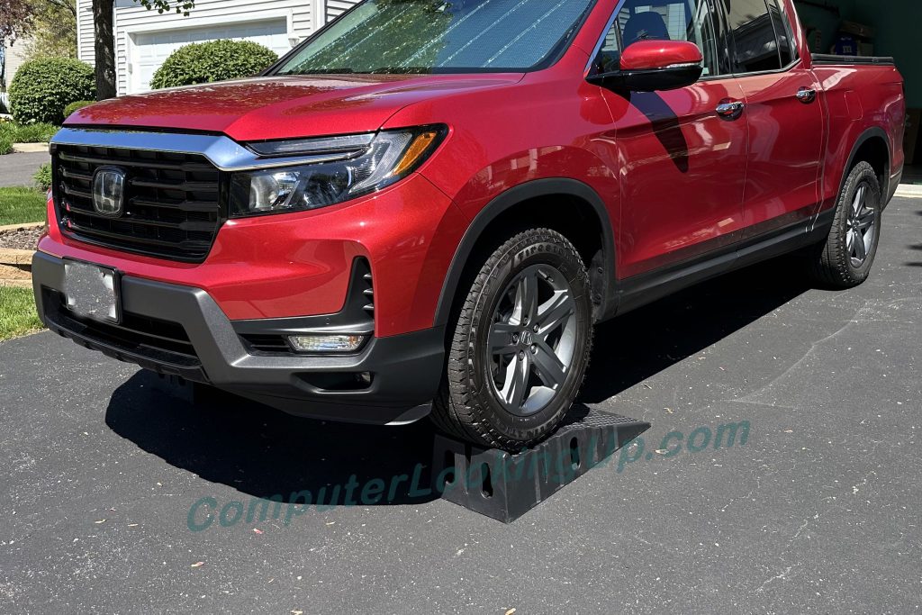 And before getting into the actual install, here is a picture of my Ridgeline up on the ramps, right before I started. It was a warm and sunny Spring afternoon. I learned that to drive the vehicle onto ramps, you first need to tuck them right up against the tires i.e. do not position the ramps away from the wheels assuming they will catch as you pull forward. But when tucked right into the rubber, it was easy.