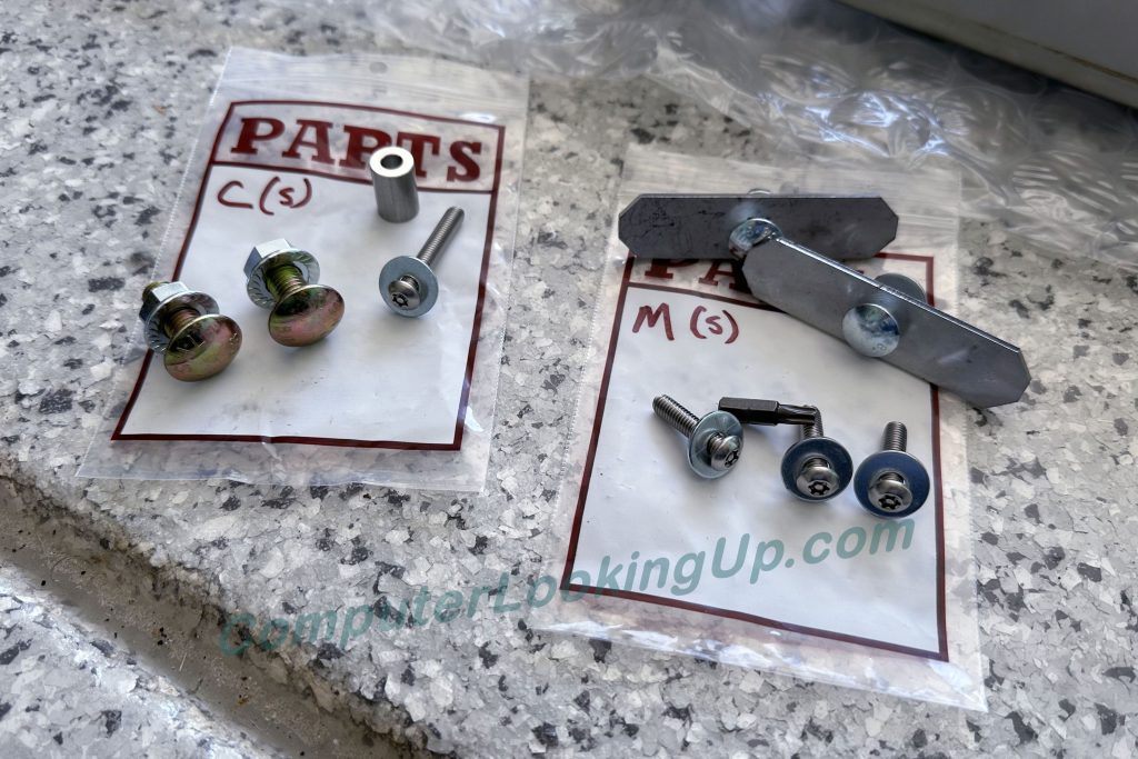 Here are closeups of the provided nut and bolt hardware, including the security kit pieces. I believe the packets were labeled with “(s)” since they included these security pieces. Note that this image is partially doctored as I “air brushed” out the specification info shown on the hex bit itself (don’t want to make it that easy for a thief to learn the correct hex size).