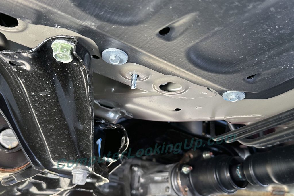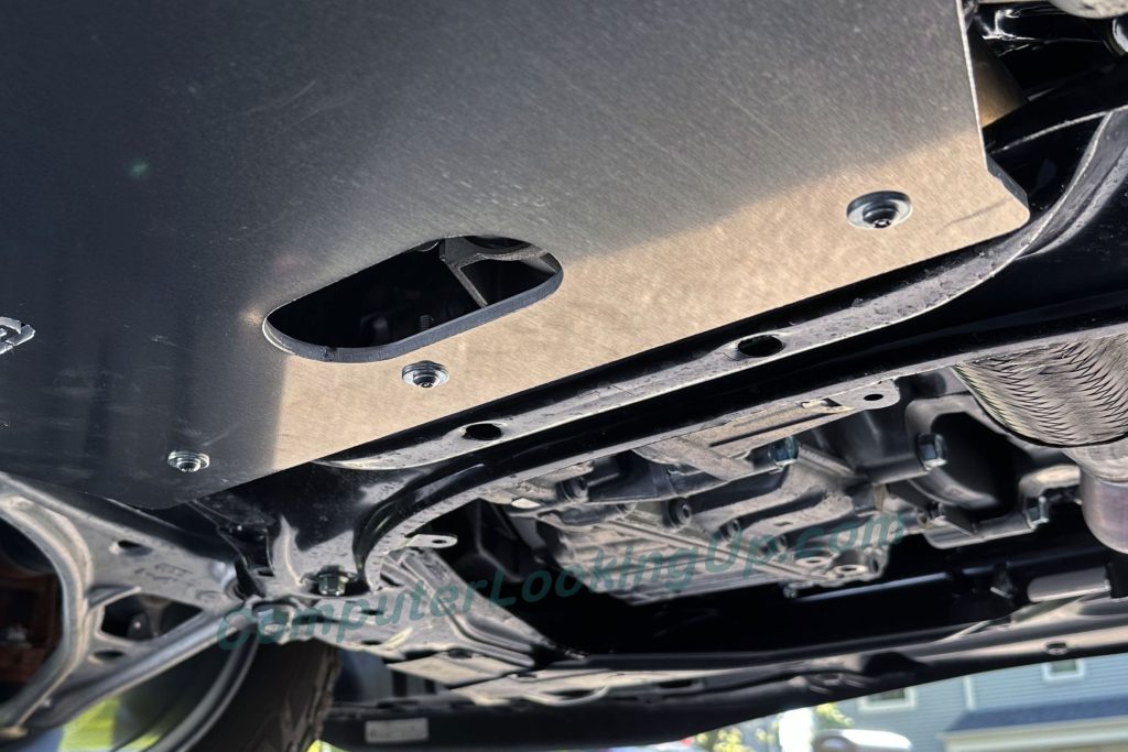 Because my Ridgeline is a stock frame, I had to use the spacer that came with the installation kit. This was not hard outside of having to reach a bit higher to hold everything while I tightened the final blot. And this is the fourth security bolt. Here is the view from the ground looking straight up; you can see a little of the spacer between the top of the skid pate and the heat shield. Smartly, this portion of the plate was designed with an oval cutout to allow easy positioning of the final bolt.