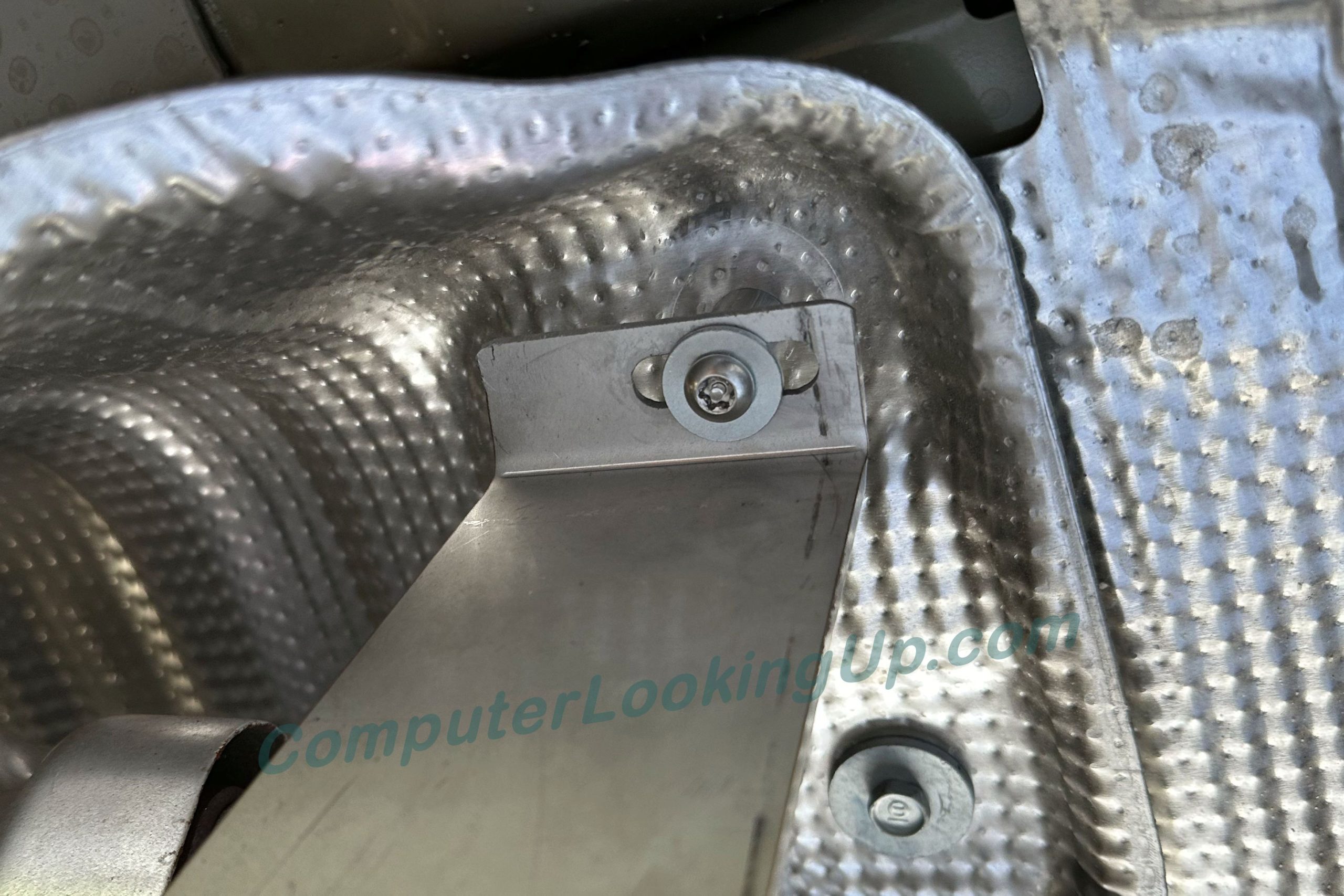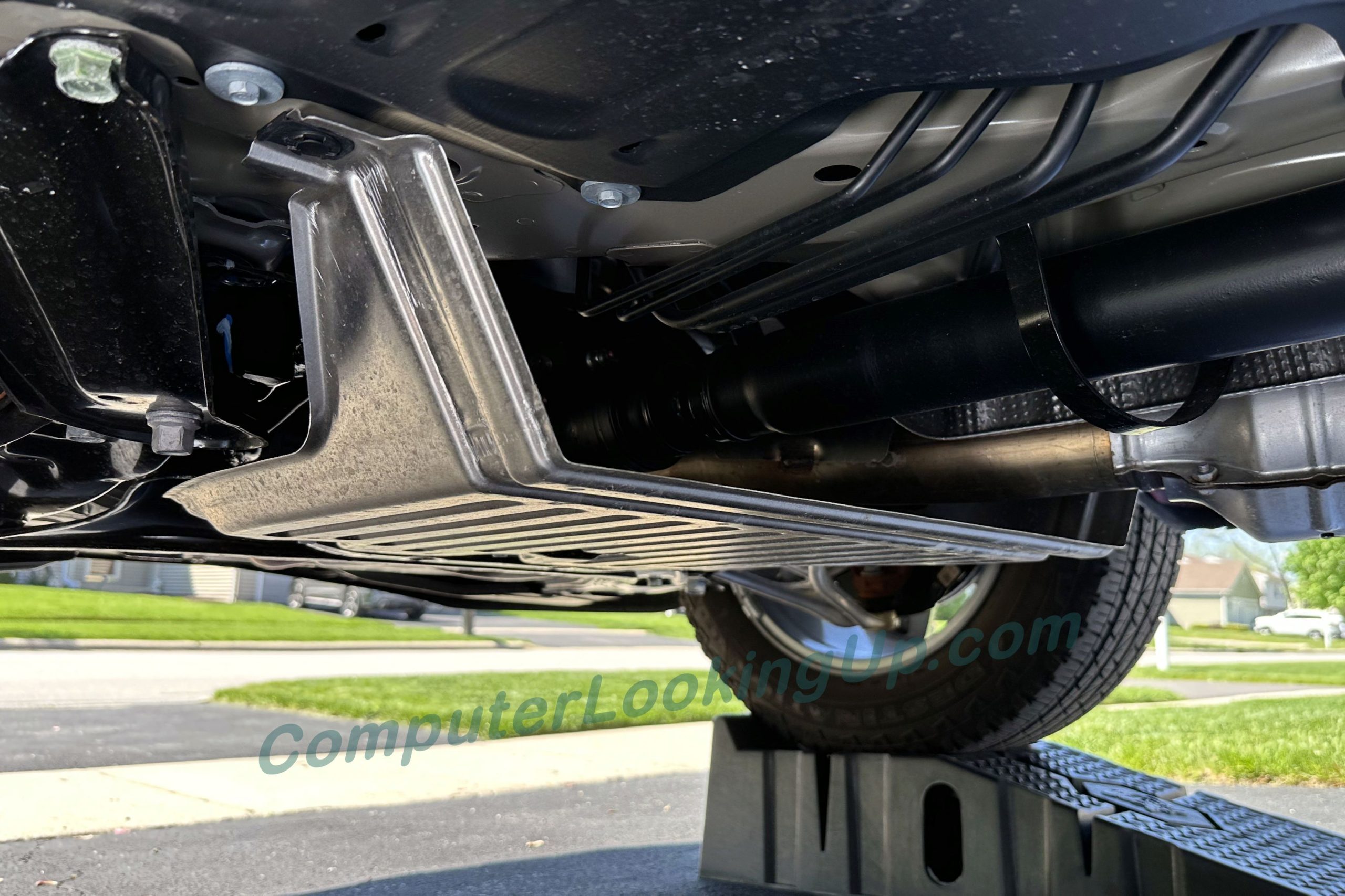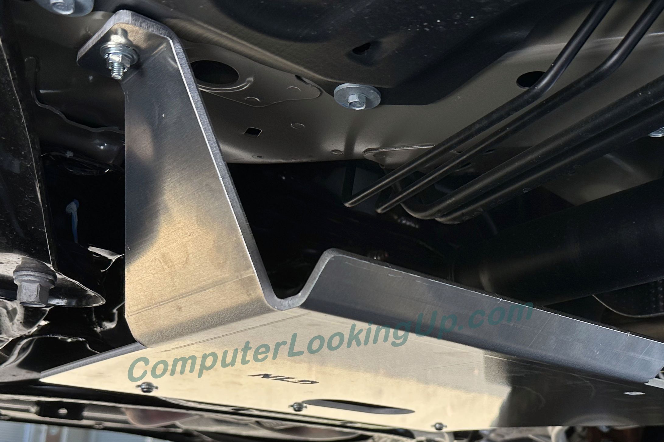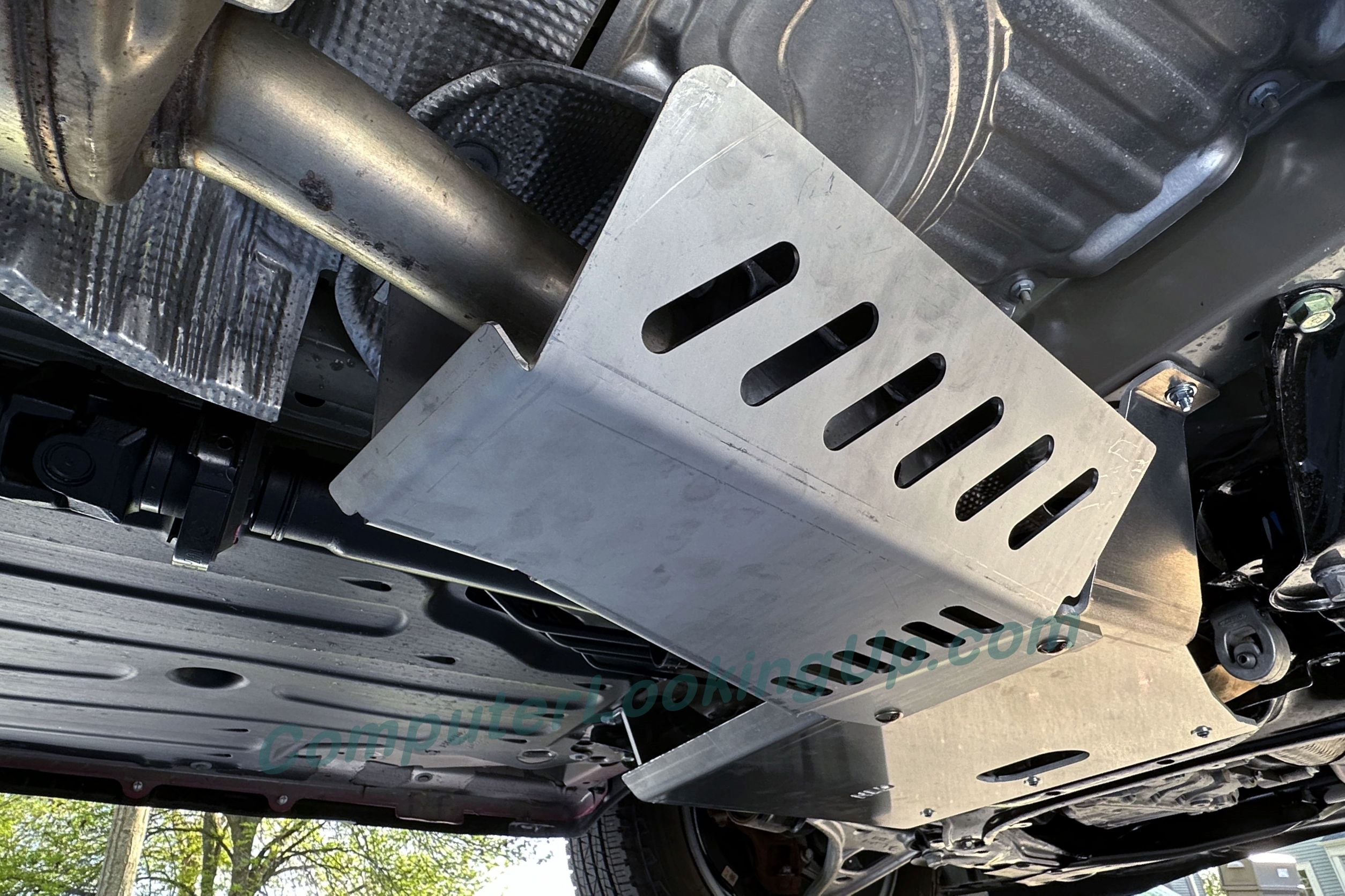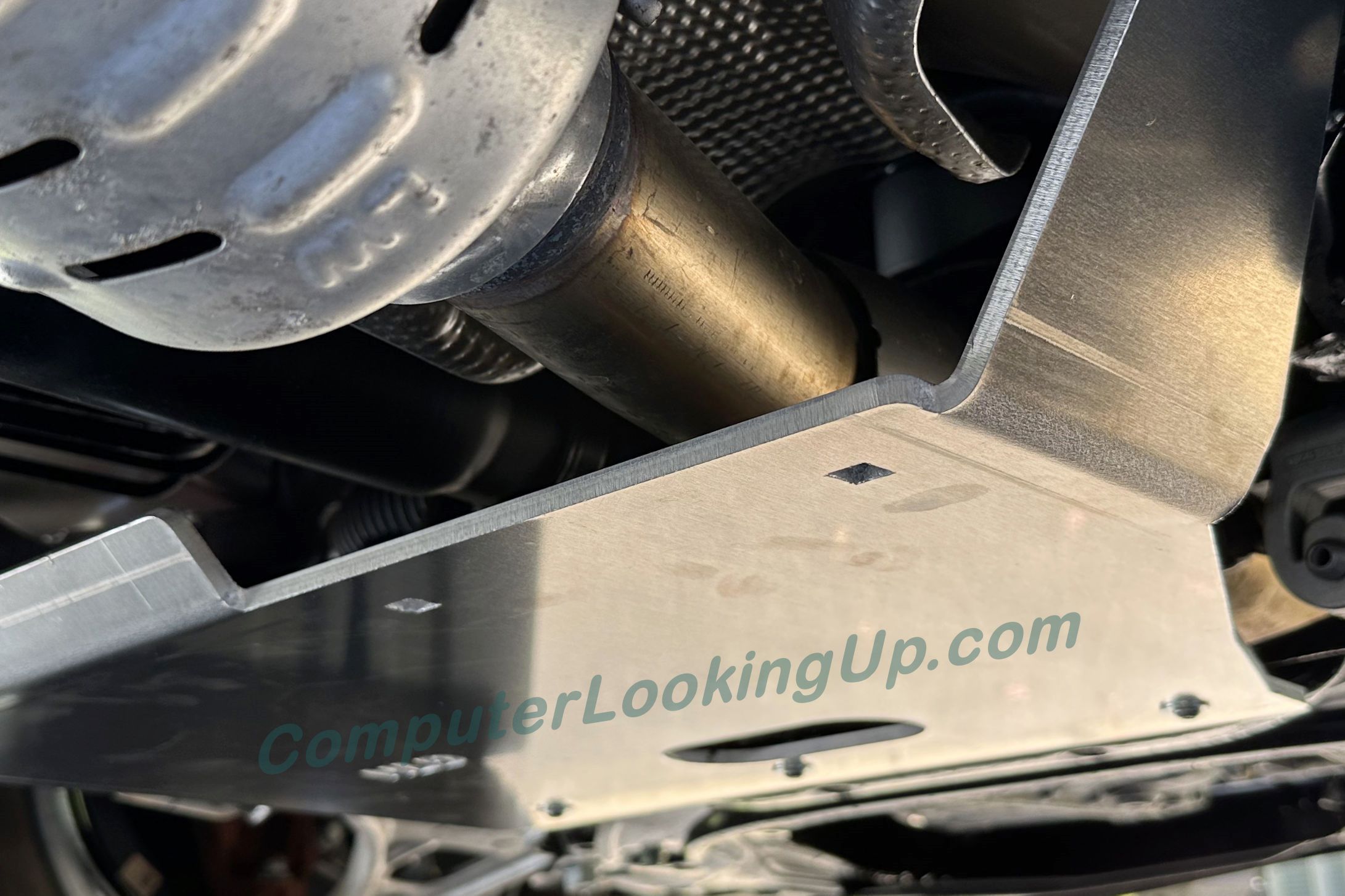 The catalytic/rear skid plate attaches by only three bolts: two onto the mid skid and one above the catalytic converter leveraging a bolt slot for the heat shield.