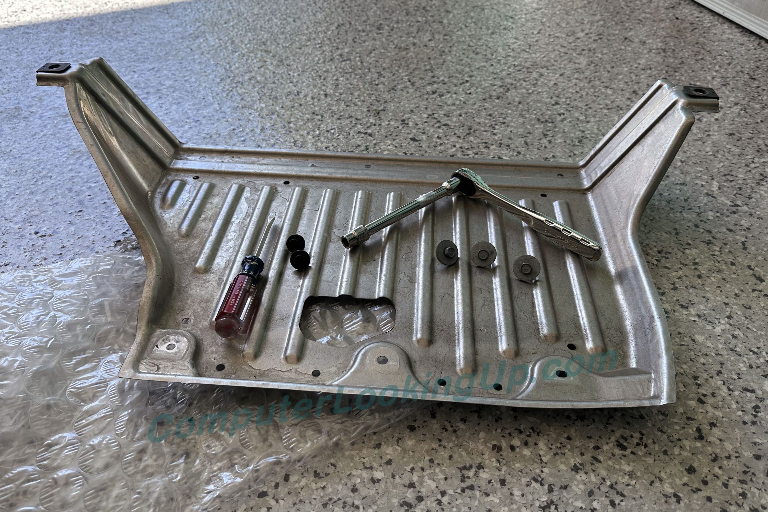 The screwdriver was to help pop out the clips holding the existing metal cover plate, as you will see in a moment. I used a little dab of Loctite on each carriage bolt. The masking tape was for affixing the carriage bolts to the frame tabs so they would stay together while being pushed through the truck’s frame into position.