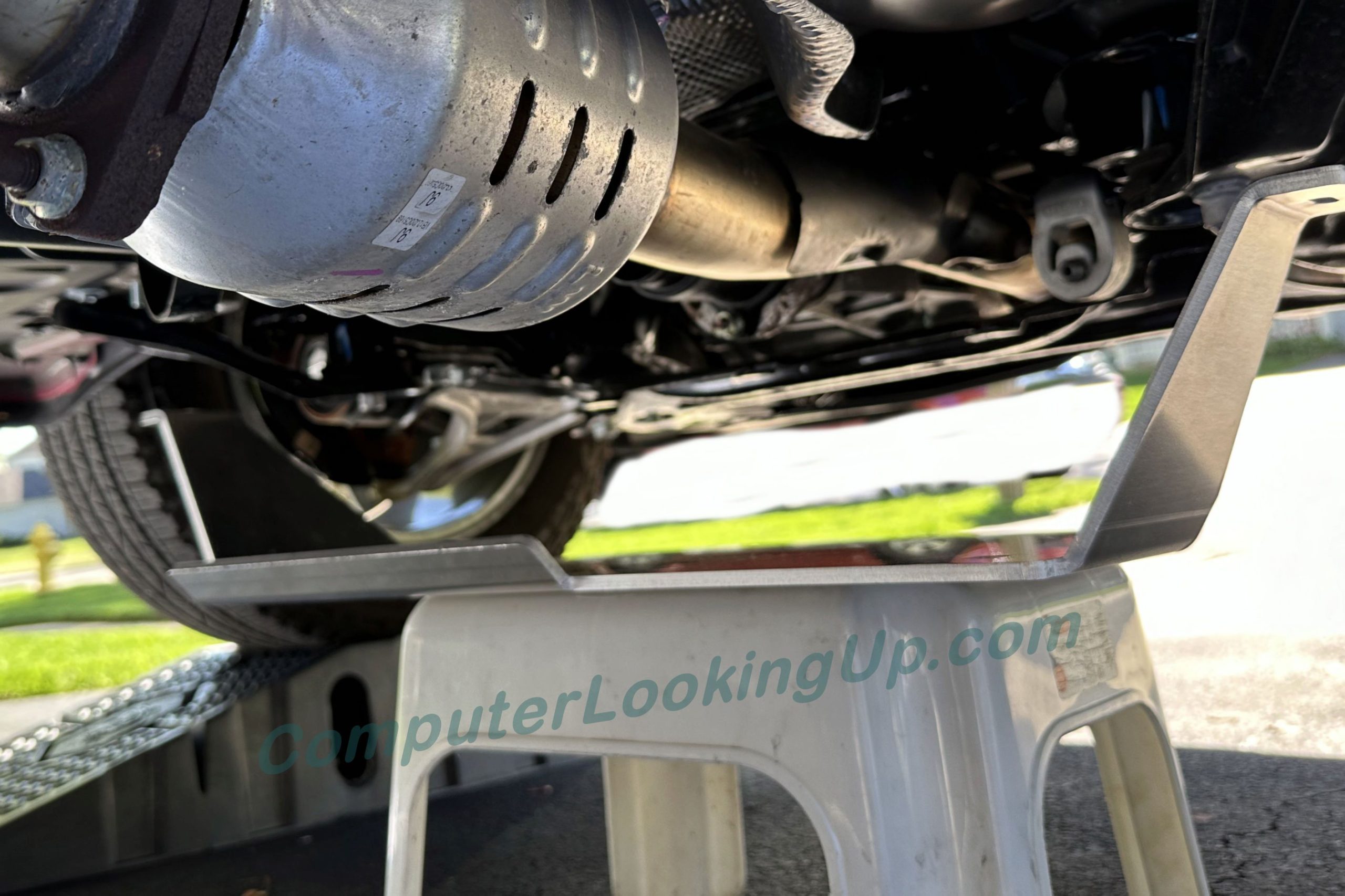 Let’s begin with a “before” picture what the stock catalytic converter setup looks like. As you can see, to say it is exposed is an understatement. It is the silver cylinder in the middle. How hard would it be, with the right tools, to cut through on the adjoining pipes and simply let the catalytic converter drop?