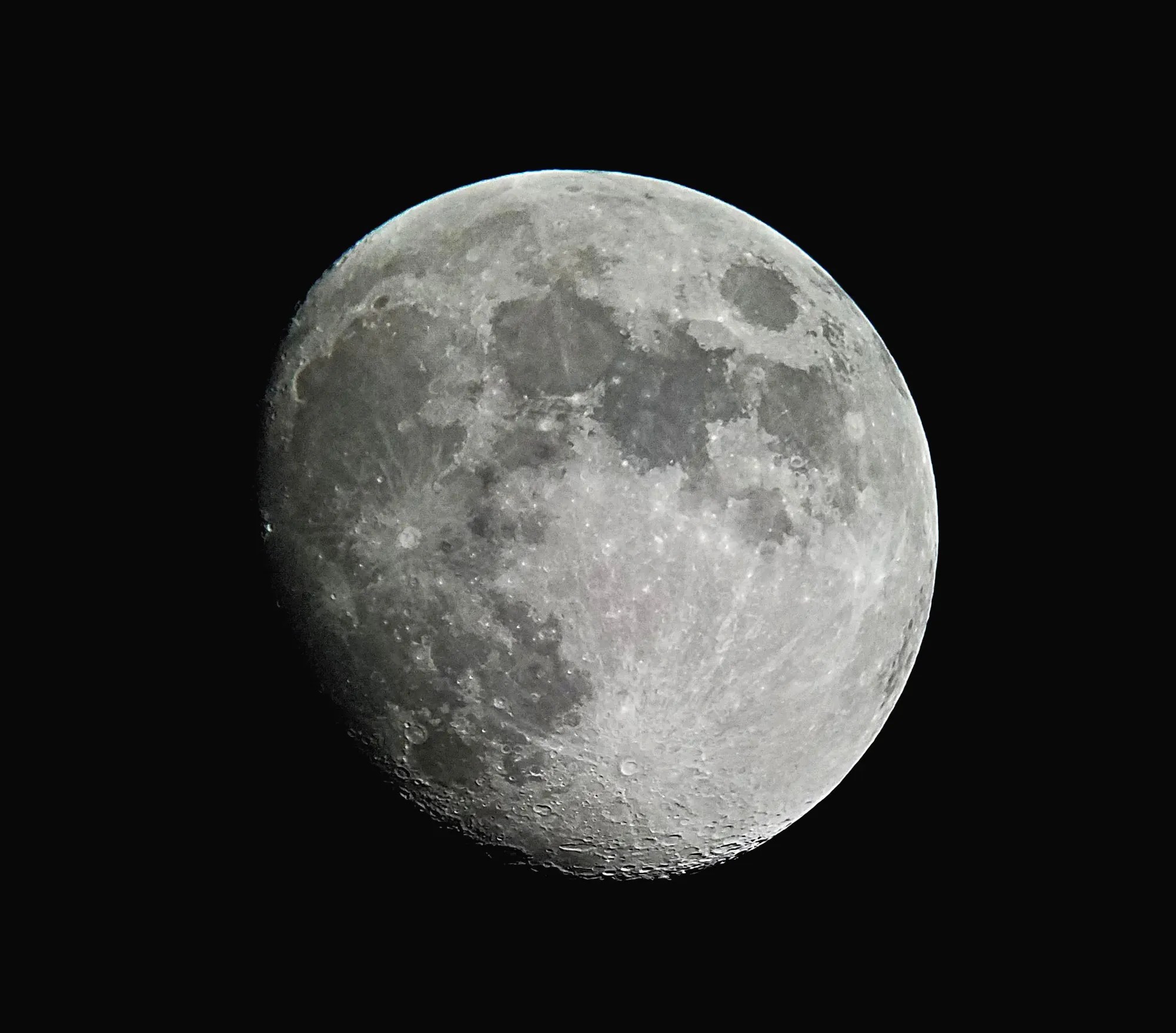 This night produced a bunch of astrophotography goodies: a near Full Moon, Jupiter, Jupiter’s moon, some separate, some together, and at different detail levels. I will be sorting through all my source images throughout the week. To start, here is a closeup of the Moon through my 10″ Dobsonian taken with my smartphone, post-processed to bring out additional sharpness and contrast.